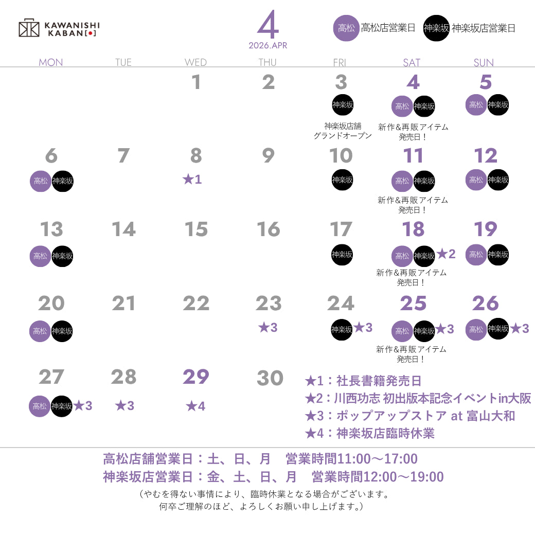 ![lauff[ラフ]|撥水オリジナルレザー](http://shop-kawanishikaban.myshopify.com/cdn/shop/files/lauff_3452d877-1eff-4a0e-8191-fee424e5d7a9_600x.progressive.webp.jpg?v=1767849638)